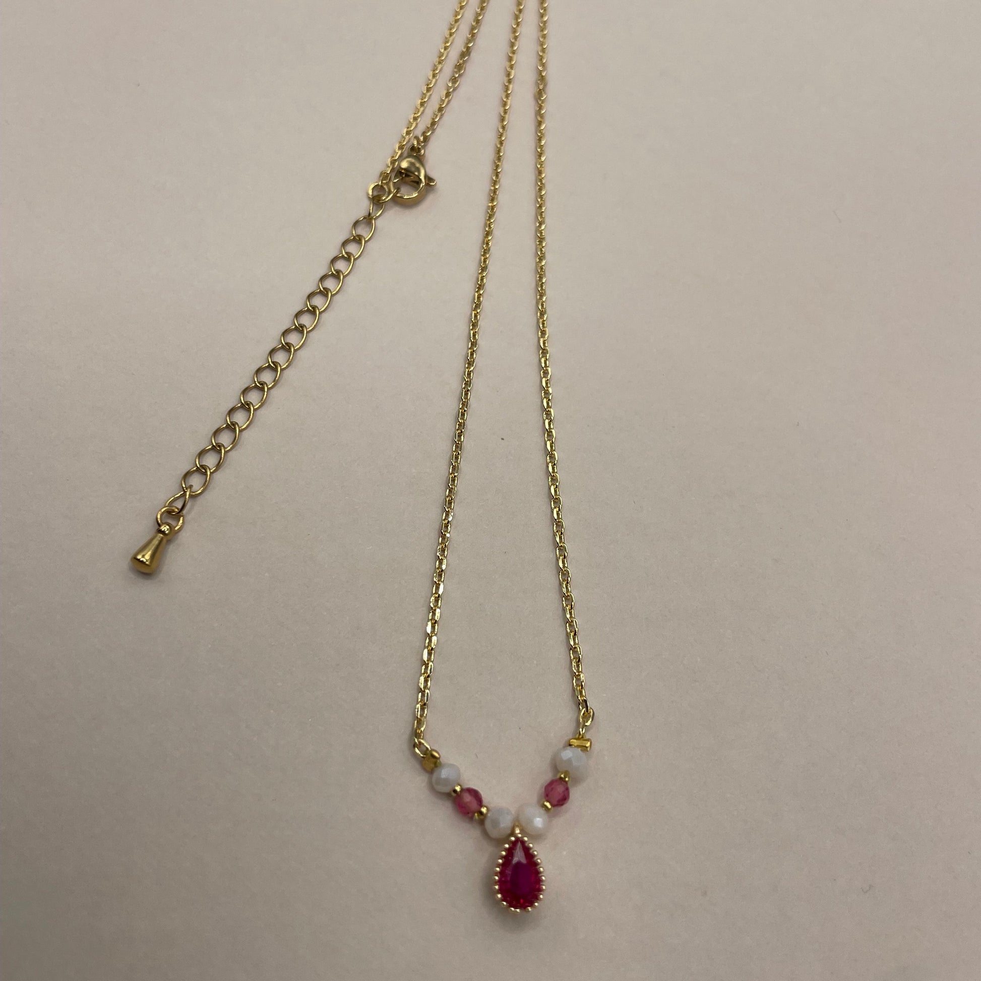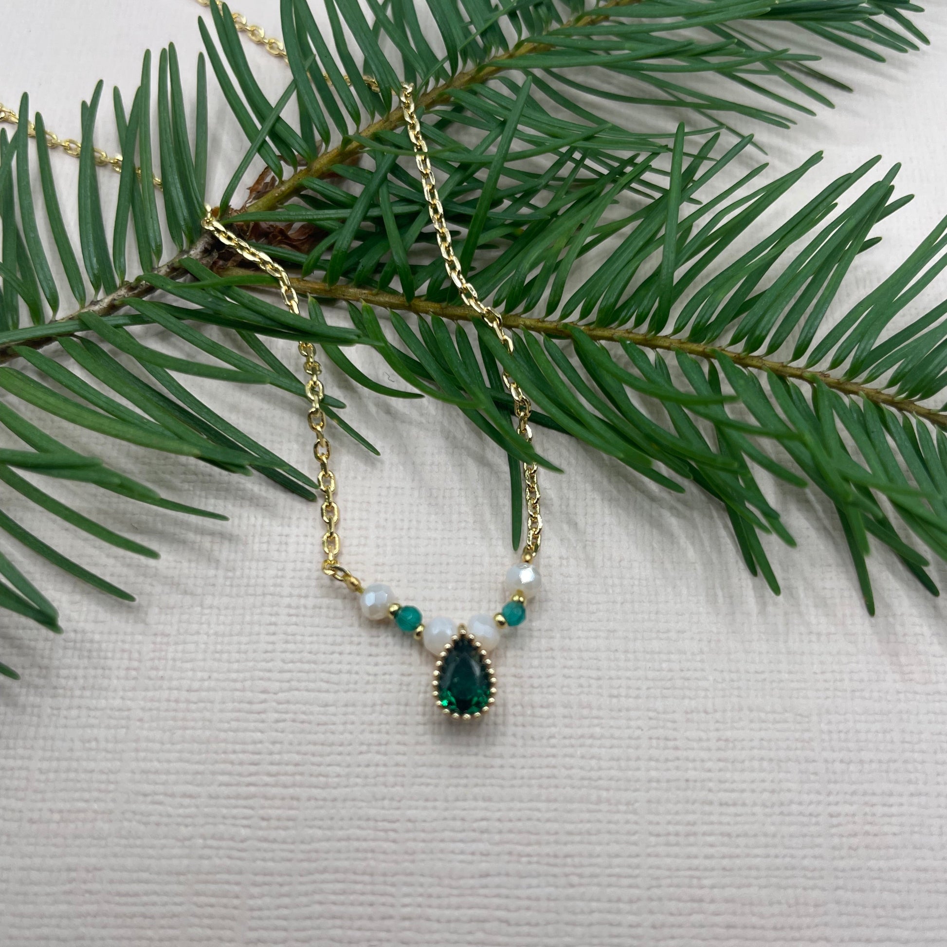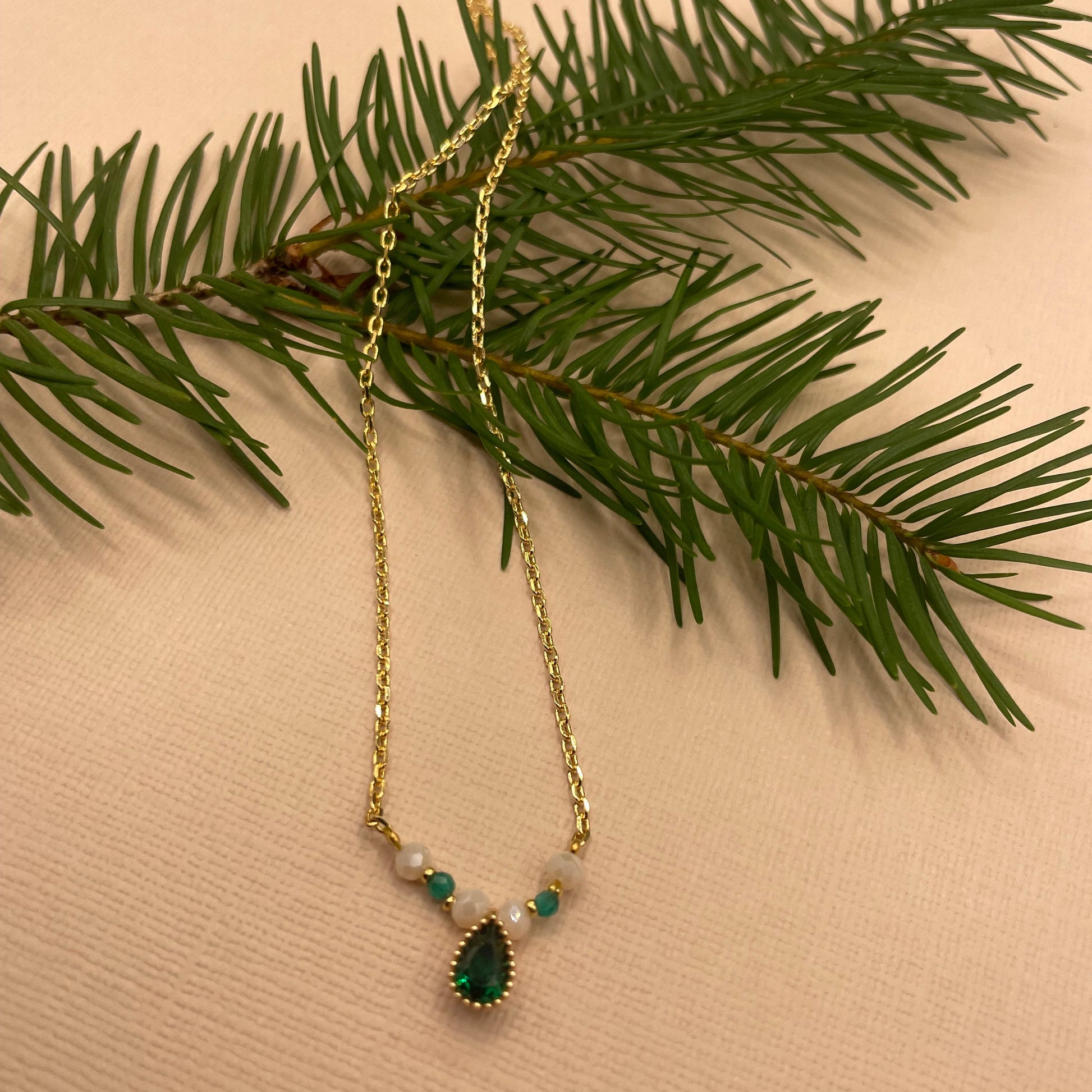 Le collier Ludmilla est composé d'une chaîne dorée à l'or fin, de perles en verre, de perles naturelles en pyrite et d'un pendentif en forme goutte. Il se porte ras du cou, seul ou associé à d'autres colliers pour encore plus d'effet.